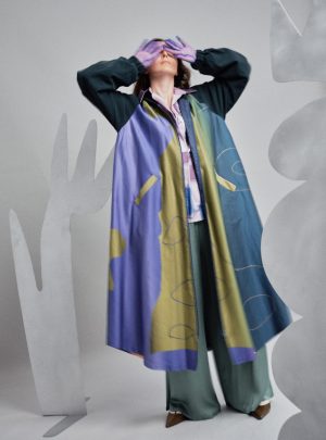A statement coat that merges classic tailoring with artistic expression. This long trench-style coat features a rich green-toned print, a structured yet flowing silhouette, and a breathable cotton lining for all-day comfort. An effortlessly elegant layer for bold styling.